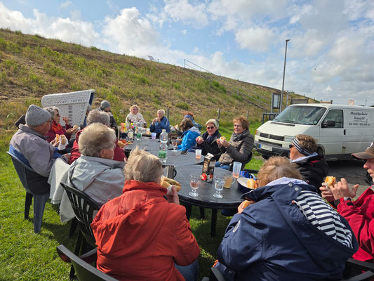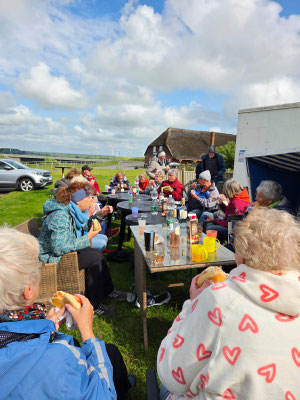 Bei starkem Wind und unsicherem Wetter ging es im Juni mit dem Fahrrad zur Fischbude nach Südwesthörn. Wer nicht Radfahren mochte, kam mit dem Auto. Dort angekommen, servierte uns Kerstin Boysen schöne Fischbrötchen und HotDogs.